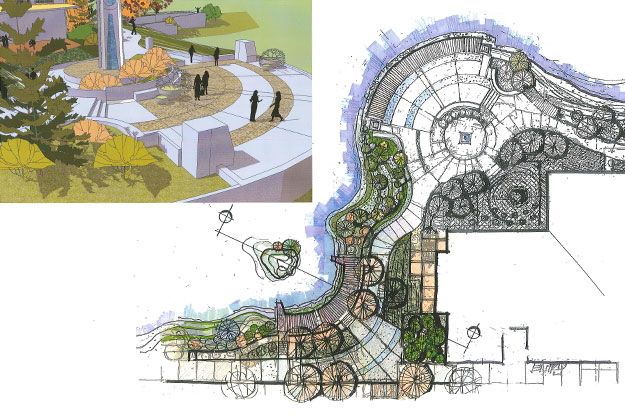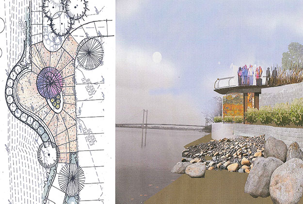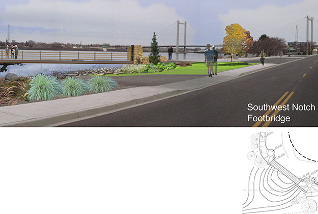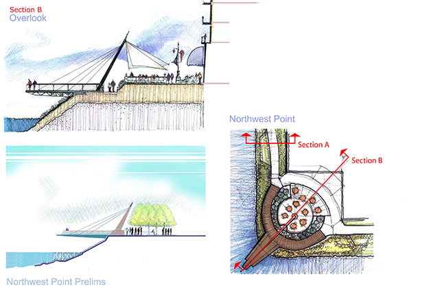 High energy gathering places included within Phase 1: lighthouse, plaza, main gateway structure, overlooks of the Columbia River, and also utility design and installation along the causeway.