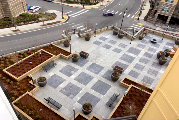 ZLA’s major involvement was with the plaza layout and proposed usage. The deck is pedestal paver, with permanent planter boxes built into the post tension slab. Site features also include benches, tables, movable planter pots and firepot circle. Additional efforts were spent on a dog park on the top western portion of the site and planted steep embankments.
