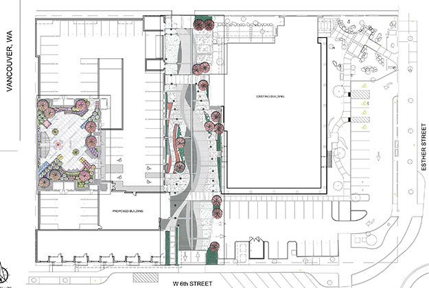 periphery of the streetscape and residential units on the top five floors. A muse (pedestrian area with vehicular access), upper courtyard and streetscape all play a part of this development in downtown Vancouver (one block west of Esther Short Park).