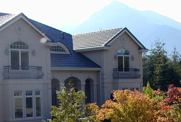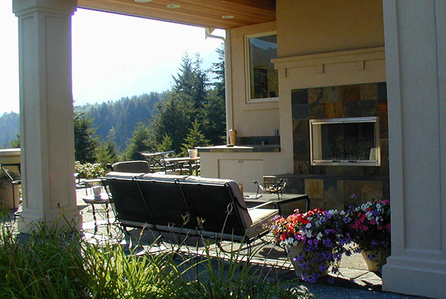Several features include a cut garden off the piano room, an outdoor barbecue space adjacent to the kitchen, the sport court on the lower terrace, the entry road winding around the fir trees into a garage court.