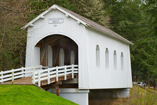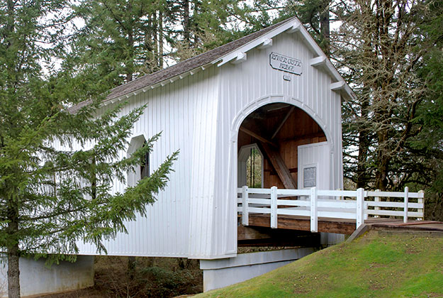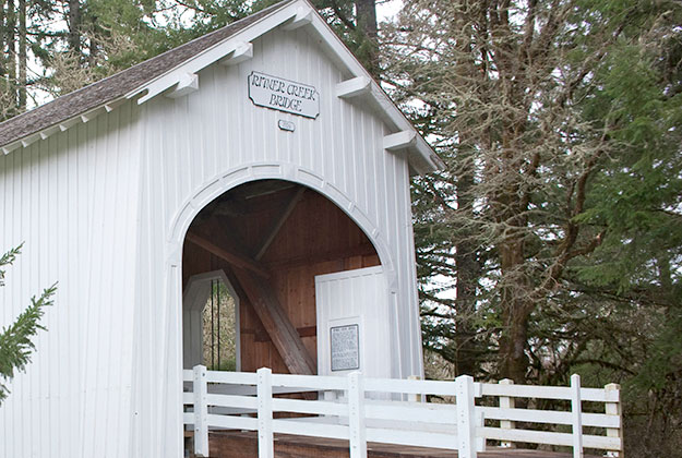 All covered bridges are recipients of the weather, especially in the Pacific Northwest. Ritner Creek Covered Bridge was no exception. Built in 1927 by Hamer and Curry Contractors for the State of Oregon it was ready to be removed for a new bridge in 1975. During that time, the Residents of Peedee, The Polk County Parks & Recreation, the State of Oregon banded together to preserve the cultural beauty to its former self. Property was obtained and a new wayside park was designed and set up for it (downstream from its original location).