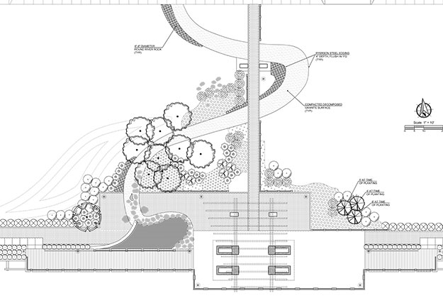 ZLA assisted with the concrete paver selection (hardscape and groundcover stone material), basalt grouping, research on the wood board walk material selection / specification and the production of landscape and irrigation plans.